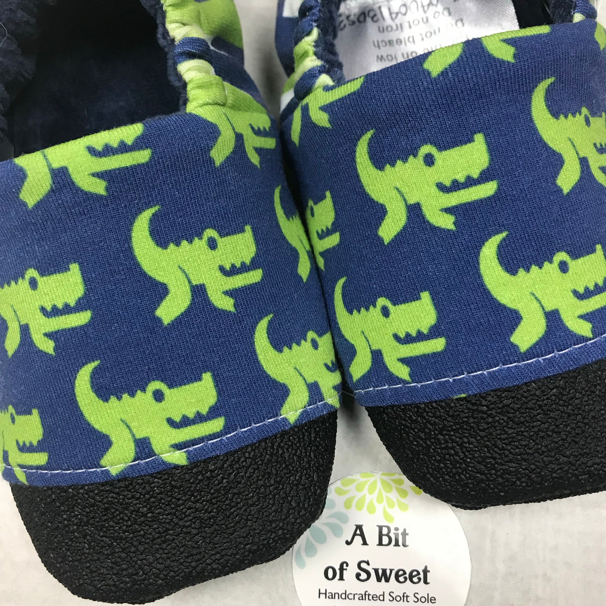 These shoes are great for little feet on the move! They are made of soft cotton lycra fabrics. Elastic on the heel keeps them from slipping off. The inners are lined with a layer of soft cotton velour for added softness and a little cushion. The insides of the shoes feature a seamless design so there are no exposed seams to irritate little feet. They are machine washable, but dry on low or air dry with a fluff after drying.