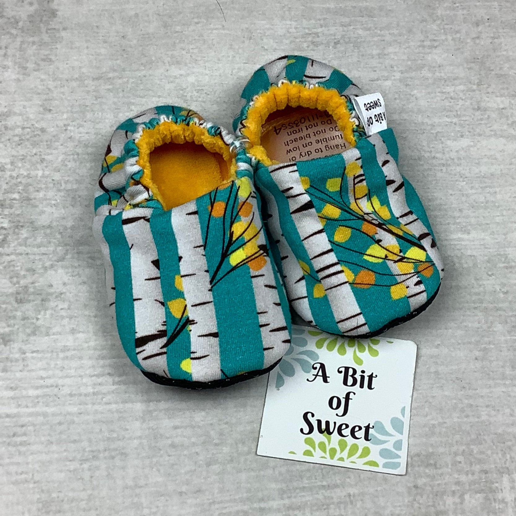 These shoes are great for little feet on the move! They are made of soft cotton lycra fabrics. Elastic on the heel keeps them from slipping off. The inners are lined with a layer of soft cotton velour for added softness and a little cushion. The insides of the shoes feature a seamless design so there are no exposed seams to irritate little feet. They are machine washable, but dry on low or air dry with a fluff after drying.