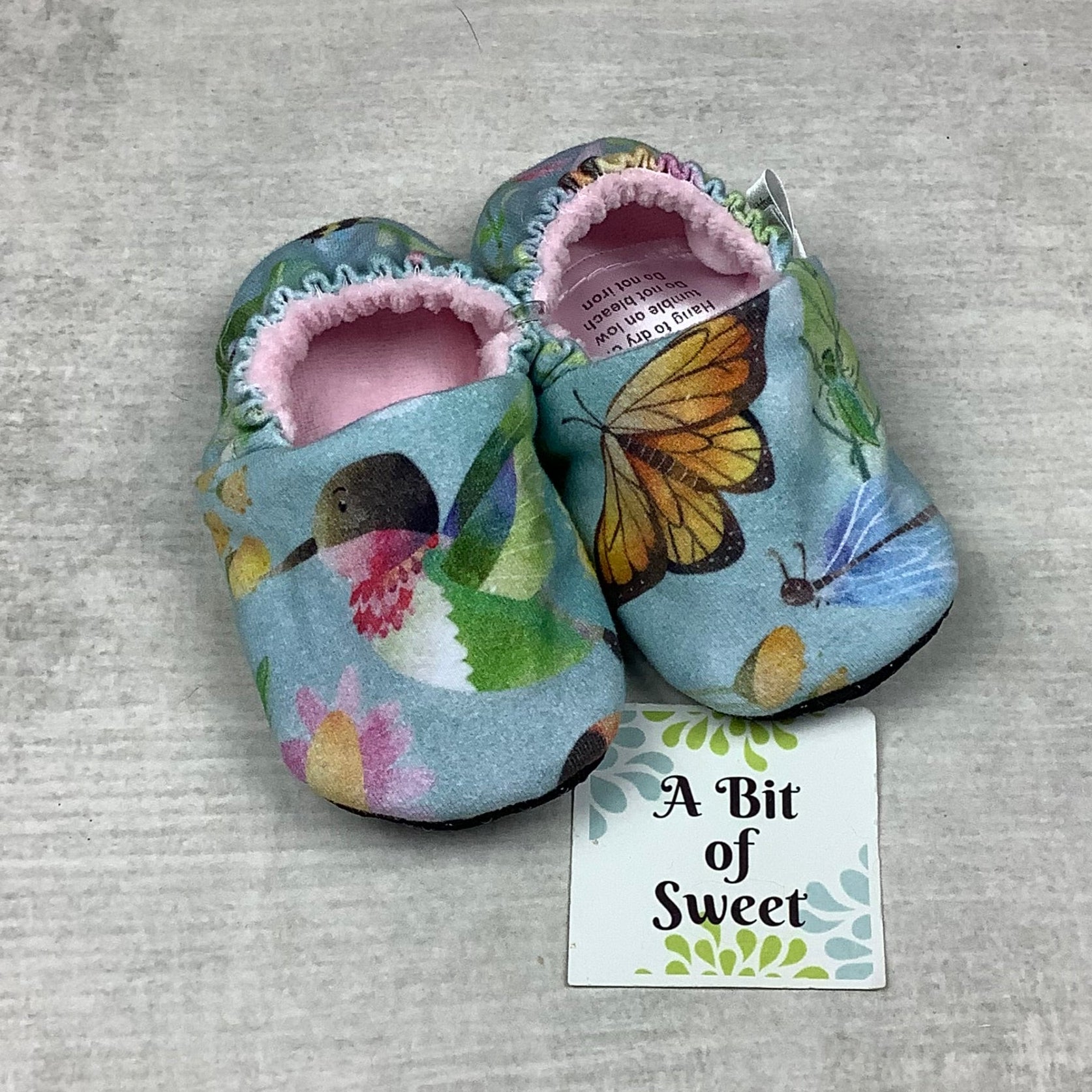 These shoes are great for little feet on the move! They are made of soft cotton lycra fabrics. Elastic on the heel keeps them from slipping off. The inners are lined with a layer of soft cotton velour for added softness and a little cushion. The insides of the shoes feature a seamless design so there are no exposed seams to irritate little feet. They are machine washable, but dry on low or air dry with a fluff after drying.